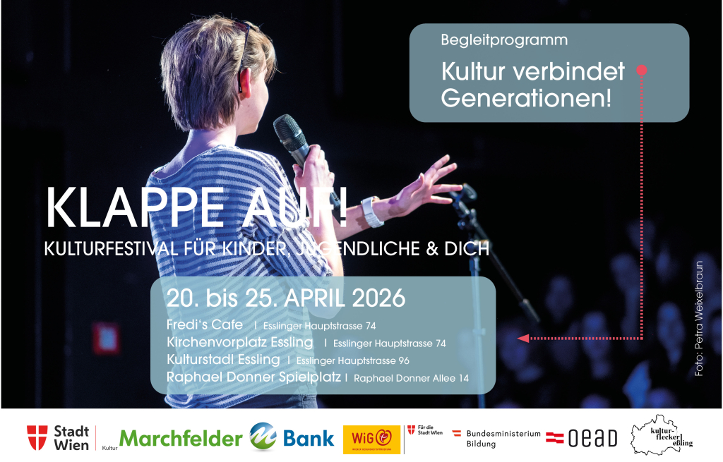 Das Festival Klappe auf! wird gefördert von Stadt Wien Kultur. Das Begleitprogramm "Kultur verbindet Generationen! Gesund zusammenleben im Stadtteil" wird gefördert von der Wiener Gesundheitsförderung – WiG im Rahmen des Programms "Gesunde Bezirke“. Die Workshops in den Schulen (Poetry Slam, Impro-Theater) werden gefördert vom Bundesministerium für Bildung sowie dem OeAD - Agentur für Bildung und Internationalisierung. Mit freundlicher Unterstützung der Marchfelder Bank. In Kooperation mit dem Kulturfleckerl Essling.