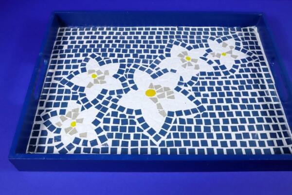 Motiv: Gänseblümchen auf blauem Hintergrund. Das Tablett ist mit weißen und gelben Glasteinen und blauem Steinzeug in aufwendiger Handarbeit gefertigt. Größe: 40x30cm. Für eine umfangreiche Auswahl an Motiven und deine Bestellung besuche bitte Ingrids Online-Shop: www.naturmosaik.at/shop
