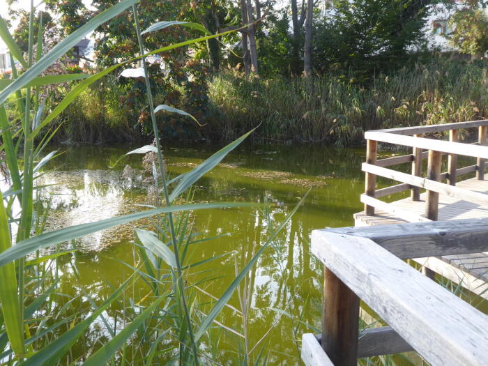 Ränder von Gewässern mit ihrem Artenreichtum ziehen seit jeher Menschen an. An diesem schönen Spätsommertag hatte ich Glück. Zwei erwachsene Frösche, einige Jungfrösche sowie Fische zeigten sich sowie gleich drei verschiedene Libellenarten. Zuletzt hatte ich vor einigen Jahrzehnten in meiner Kindheit heranwachsende Frösche gesehen. Man braucht nicht unbedingt extra Zeit um sich an der Fauna und Flora des Teiches zu erfreuen. Bloß ein aufmerksamer Gang durch den Park genügt um mit etwas Glück einen Frosch im Teich oder eine Libelle am Holzsteg zu erblicken. Mitten im Park liefert ein Hydrant wertvolles Trinkwasser. Einer der Sitzplätze ist von einem Dach bedeckt, auf dem genügsame kleine Pflanzen gedeihen die auch mit wenig Regenwasser auskommen.
